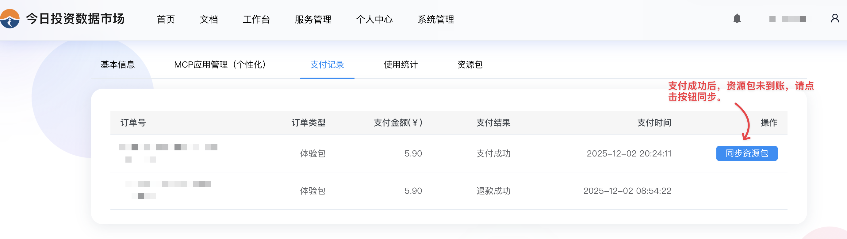如果您支付成功后资源包未到账,请在个人中心进行资源包同步。如果同步出现问题,请联系我们。